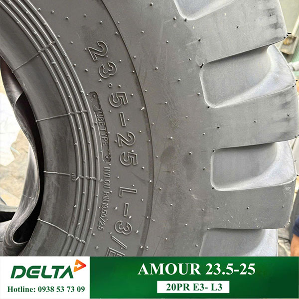 Lốp xúc lật 23.5-25 AMOUR có kiểu gai E3- L3 (hay còn gọi là gai dấu ngã), sử dụng khá phổ biến tại Việt Nam. Lốp được sản xuất theo công nghệ mới, loại không sử dụng ruột yếm (TL). Ưu điểm của lốp TL giảm nhiệt sinh ra do ma sát giữa lốp, ruột, yếm trong quá trình xe hoạt động. Ngoài ra, lốp TL còn giúp tản nhiệt tốt, giúp tăng tuổi thọ của lốp, giảm tình trạng lốp bị bể đột ngột do xe hoạt động cường độ cao.